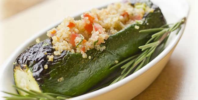 Vamos a empezar nuestra lista de platos vegetarianos por una receta muy sabrosa y fácil de preparar. Esta calabacín rellenos con quinua te va a ofrecer unos 20 gramos de proteína, casi la mitad de la proteína diaria que una persona necesita consumir. Esto quiere decir que la carne no va a hacer falta en la comida que usted incluir este plato.